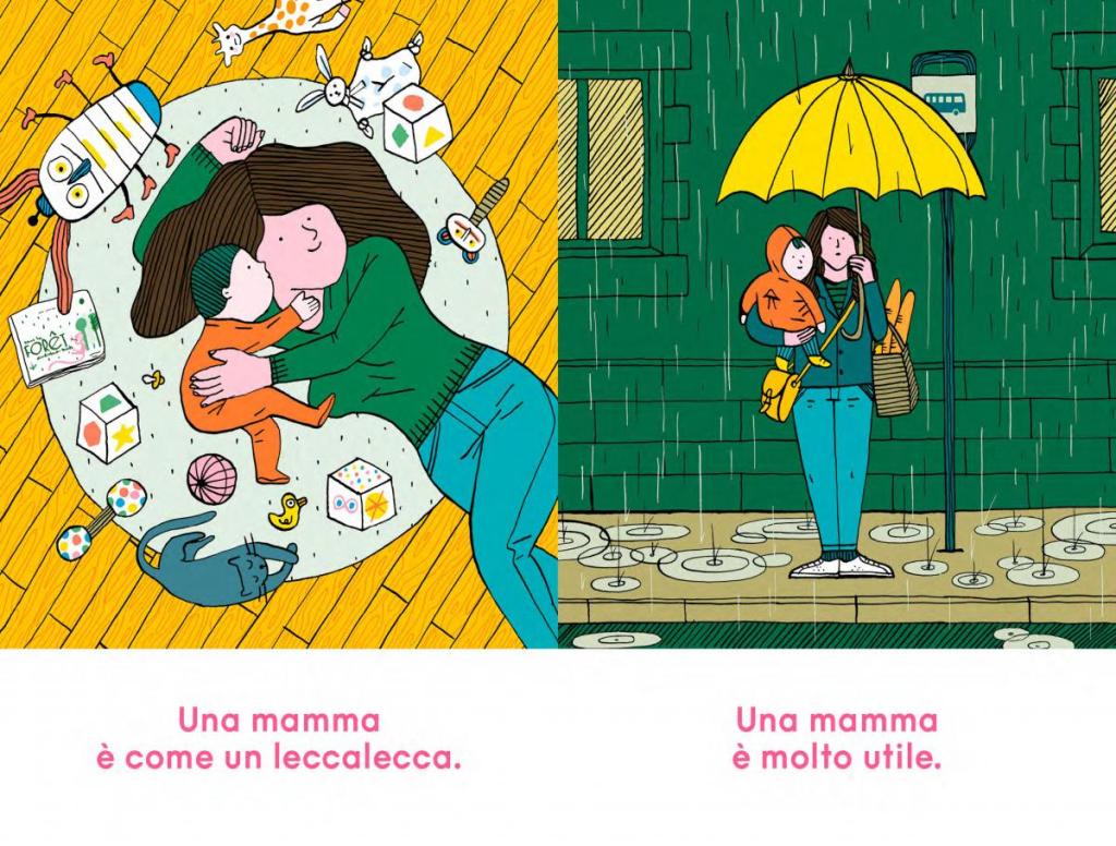 I colori vivaci e fluorescenti delle illustrazioni, i contorni nitidi e il cartoncino spesso delle pagine, fanno di questo albo un piccolo tesoro, che spinge chi lo sfoglia a ricercare dettagli ed emozioni del proprio vissuto. Il testo è quasi del tutto assente fatto salvo per la metafora presente a ogni fondo pagina “una mamma è come…”. Aurore Petit, in questo albo, tramite un veritiero racconto per immagini, ci mostra i molti volti di una mamma. C’è la mamma canguro con il suo piccolo in fascia e quel senso di eroismo stampato sul volto, che solo una mamma che ha appena partorito può capire. C’è la mamma “che è come una fontana” in una tenerissima scena in cui il papà imbocca la sua compagna che sta allattando.