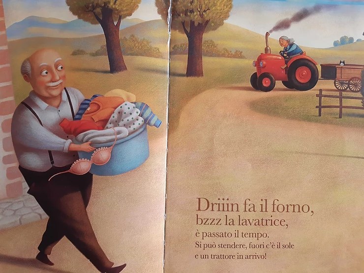 “Il trattore della nonna” racconta con naturalezza la quotidianità di una coppia di anziani in cui la nonna svolge attività tradizionalmente attribuite agli uomini, mentre il nonno si dedica a compiti solitamente considerati femminili. Un piacevole ribaltamento dei ruoli tradizionali, che sfida l’idea stereotipata della donna in cucina e dell’uomo al lavoro fuori casa. Proprio per questo, la casa editrice Giralangolo ha dato vita alla Collana Sottosopra, un progetto editoriale ambizioso che mira a contribuire all’abbattimento degli stereotipi di genere nella letteratura per l’infanzia.