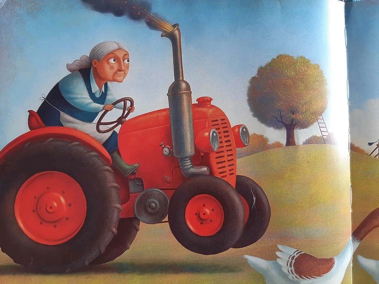 “Il trattore della nonna” è un racconto che celebra la vita di campagna in tutta la sua bellezza: il sole che fa capolino sulle colline ondulate, il lavoro nei campi..ma anche il profumo di cose buone, i doni della terra e l’aria frizzante di primo mattino. Ha piovuto tutta la notte: l’erba è più verde e l’aria è pervasa dal petricor. Grosse gocciolone di pioggia cadono in sequenza dal tetto della cascina sul marciapiede di pietra, facendo paf paf. Una nuova giornata ha inizio e l’aria fresca di inizio autunno dà il buongiorno a nonno e nonna.