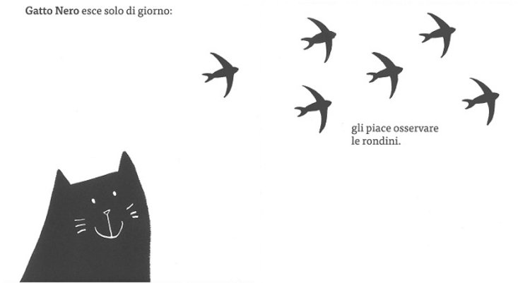 Gatto Nero – che è nero dalla punta delle orecchie giù fino a quella della coda – ama girovagare di giorno, osservare le rondini e chiacchierare con il suo amico corvo.