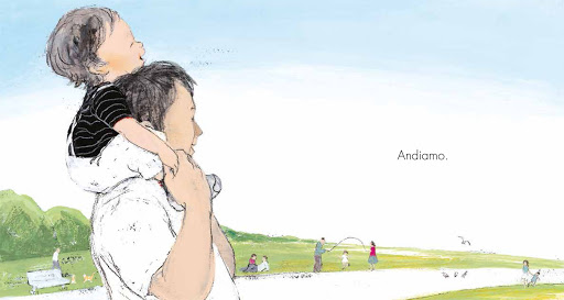 La prospettiva della storia è appositamente realizzata ad altezza bambino: l’inquadratura bassa e il campo visivo stretto, ci rendono partecipi alla narrazione. Un tempo lento, dilatato, come quando da bambini si gioca e il tempo sembra non passare mai. E durante la lettura, ci sembra di entrare anche noi in questo vortice di lentezza, che viene interrotto quando, il campo visivo si apre, e la bambina viene presa tra le braccia del suo papà.
