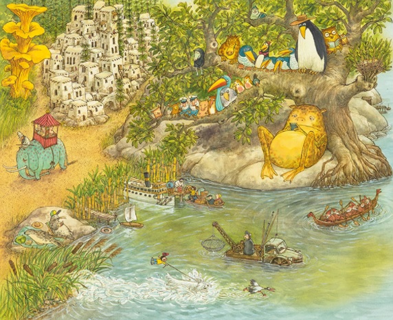 Rientra nella categoria degli albi “brulicanti” con le sue grandi, spettacolari tavole che ricreano ognuna una sorta di mondo parallelo, ricchissime di dettagli infiniti, di vita, di pura meraviglia.