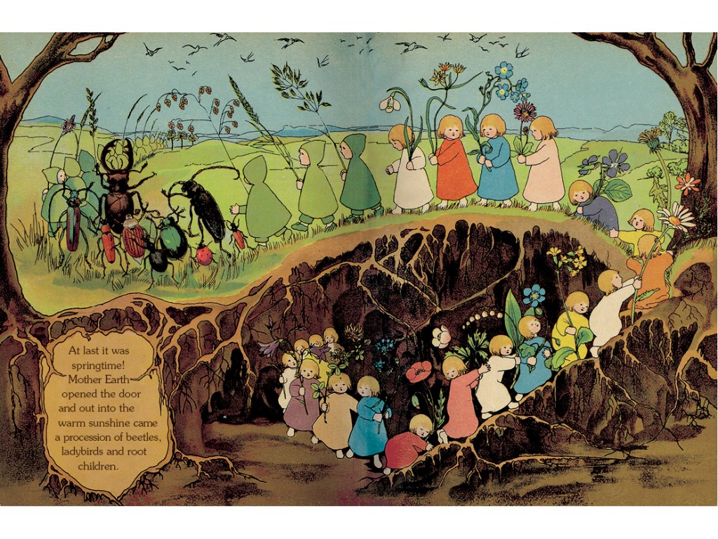 E’ su quella scia che vengono pubblicati nei primi anni del ‘900 i libri di Elsa Beskow, Sybille von Olfers e Beatrix Potter, tra gli altri, opere che rappresentano un’infanzia che si fonde e si confonde con il mondo naturale e animale. Il legame tra umanità e vegetalità emerge, ad esempio, nel mondo sotterraneo dei Bambini radice di Sybille Von Olfers, in cui bambini-fiore e insetti rispondono al dolce richiamo di una madre terra che sveglia i suoi figli. Appaiono anche nei racconti di Beatrix Potter dove la campagna assume a luogo di autenticità nella semplicità del quotidiano. Elsa Beskow, grande autrice e illustratrice svedese racconta nei suoi libri l’incontro e l’intreccio tra bambino, animale e vegetale, mostrando l’alterità del bambino rispetto all’adulto.